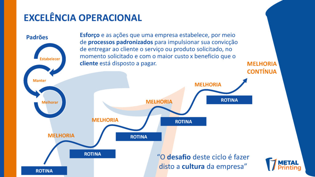 A Metal Printing, por meio de sua unidade de Excelência Operacional, oferece treinamentos técnicos como contrapartida em negociações comerciais, com o objetivo de fortalecer as competências dos nossos clientes em processos e operações industriais.